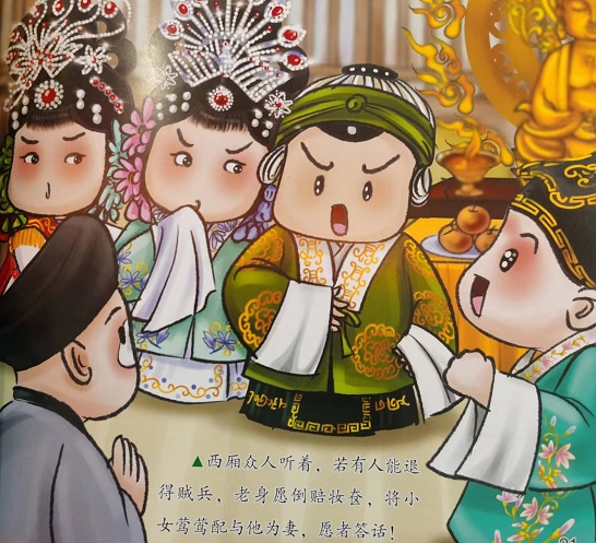 京剧《红娘》,唐贞元年间,西洛书生张珙进京应试,在河中府普救寺邂逅崔相国的女儿崔莺莺,二人一见倾心。张珙乃搬入寺内,居住西厢之侧,以期伺机与崔莺莺相近。河中叛将孙飞虎,知崔莺莺貌美,兵围普救寺,欲掠之。崔夫人于危急中誓言:“有人能退去贼兵,愿倒赔妆奁,将莺莺之为妻。”张珙有挚友白马将军杜确,统兵镇守蒲关,乃修书一封,命寺僧惠明下书往邀杜确前来解围。杜确剿灭孙飞虎之后,张珙本思与崔莺莺结成夫妇,岂知崔夫人嫌其为白衣秀士,悔却前言,借词推托。张珙与崔莺莺两心怏怏,红娘乃往来传书递柬,先使二人在花园相会,继之更促成二人婚事,共度佳期。事为崔夫人闻知,怒笞红娘。红娘据理申辩,并责崔夫人出尔反尔之过,终使崔夫人张口结舌,无言以对,依红娘之见,准张珙与崔莺莺结亲,但须张珙赴试高中之后,始允成礼。张珙遂离河中,取路入都。至此,张珙与崔莺莺之事,告一段落。