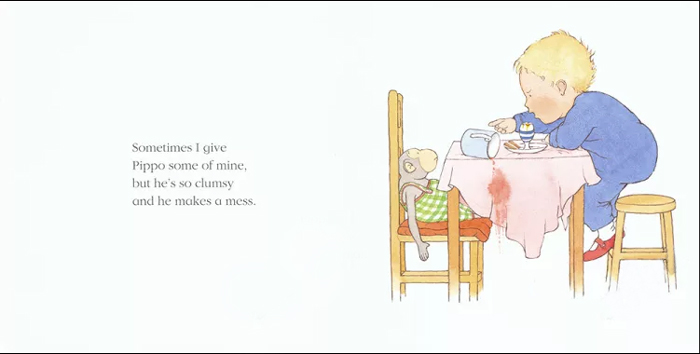 “有时我会给Pippo一些吃的,但是他很笨,总是弄得一团糟。”猜猜到底是谁打翻了杯子?