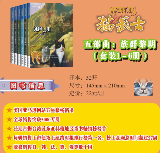 “猫武士”系列是一部写给孩子的励志传奇,一部震撼心灵的动物小说。全球销量突破3000万册;畅销30多个国家和地区,深受世界儿童的喜爱。每集上市便登上《纽约时报》排行榜,榜上盘踞总时间超过108周。