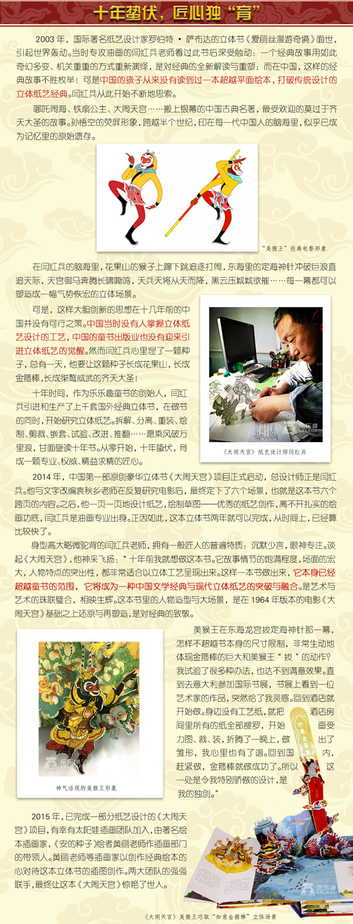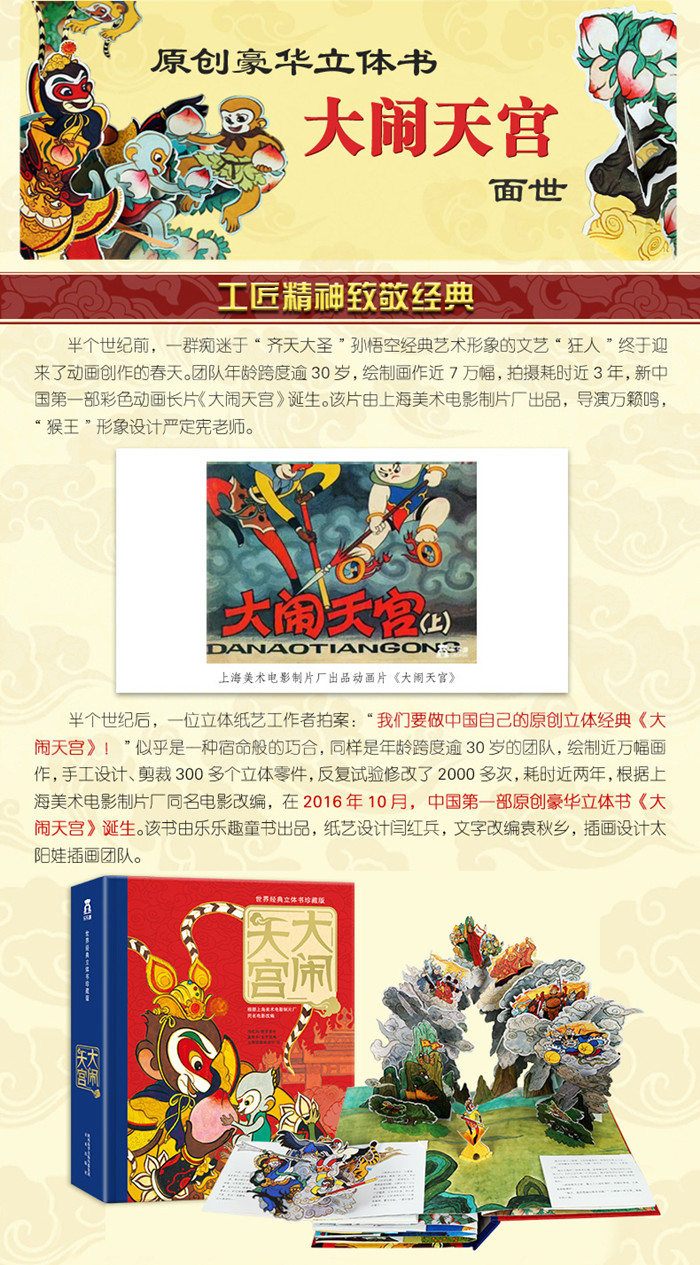 本书包含近300个零件,将电影中的精彩桥段浓缩为6个跨页,将猴王孙悟空练兵花果山、喜得金箍棒,到带领孩儿们与玉皇大帝派出的十万天兵天将激烈对战,到掀翻了天庭自封“齐天大圣”逍遥度日。每一页都再现电影中的精彩场景,精致的立体与精彩的文字相映成辉,让80后的大孩子忆起儿时的动画片,让小朋友们认识中国的经典形象,感受中国文化的魅力。