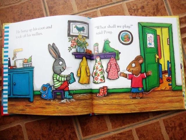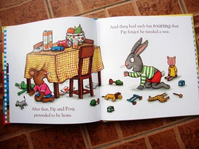 Pip and Posy是一对典型的孩子:他们是最好的朋友(在大部分时间里),他们喜欢一起玩耍……但有时他们也像其他孩子一样,会吵闹和斗气。所以,友谊也需要交流和理解,这也是该系列的一个主题。在这本书里,Pip来到Posy家玩,多美好的一段时间,玩得尽兴的Pip忘记了上洗手间,于是发生了点小意外,Posy家的地板上出现了一个小水荡……