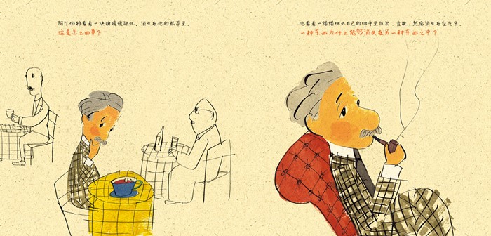 2. 温暖的色调,让孩子容易阅读;书中水粉、钢笔和墨水构成的画面,饱含着幽默和孩子气,传达了爱因斯坦的独特个性;红色文字则传达了文本的重要思想;每一张书页用斑驳的纹理纸印刷,强化了“世间一切都由原子构成”这个概念。孩子们将从一本书的各个细节,体会爱因斯坦的精神和理念。