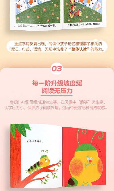 《小羊上山儿童汉语分级读物》是汉语分级读物领军人孙蓓老师联合靠前一线教育专家、成熟绘本作者和插画师为4~7岁处于识字、阅读敏感期的孩子匠心编写的中国原创汉语分级读物书系。本系列依据新版小学语文课程标准,先用高频核心汉字设定各级字表,后创作全新图画故事,以帮助孩子零基础学会独立阅读,轻松度过幼小衔接关键期。丛书根据孩子的阅读字量范围分为14个级别,其中前8级为学龄前儿童阅读字量,后6级为小学1-3年级儿童阅读字量。全套丛书拥有完整、完善的线上、线下辅助学习体系,每一级均提供配套的阅读指导课、阅读精读课和音频课,以及家长指导手册等,用科学的方法全面引领孩子走向阅读的殿堂。对应的《小羊上山儿童汉语分级读物 级》,故事生动丰富且寓教于乐,涵盖原创故事、经典童话、科普和生活类故事,语言文字优美,富有韵律,插画细腻有质感,使孩子在快乐的阅读中潜移默化地学会适合他年龄的汉字,帮助孩子收获自信心和成...……