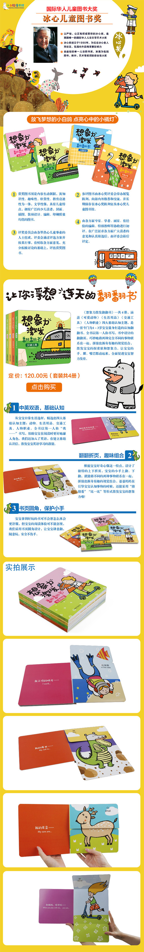 《想象力激发翻翻书》是专门为1-3岁的宝宝量身打造的认知翻翻书。本套书涵盖了四大基础认知主题《可爱动物》 《交通工具》 《生活用品》 《人物职业》,满足宝宝的认知需求。书中每页都设置了独特的翻翻页,巧妙地将两种完全不同的动物、交通工具等宝宝常见的事物联系在一起,通过宝宝的小手翻一翻,呈现出非常有趣的视觉效果。不仅能提高宝宝的认知能力,而且能满足宝宝的好奇心,激发宝宝的想象力。