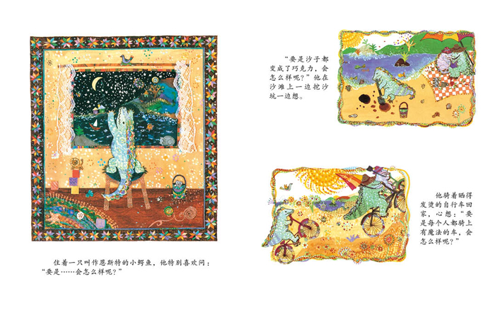 无论孩子或是艺术家都无法拒绝这样的故事开头:“从前,在一个到处是阳光、大树、昆虫、贝壳、鸟儿和美丽夜色的地方……住着一只叫作恩斯特的小鳄鱼,他特别喜欢问‘要是……会怎么样呢?’”作者用点绘和晕染的手法绘制了这些饱满而精巧的画面,映现出小鳄鱼心中那个明净光亮的世界。