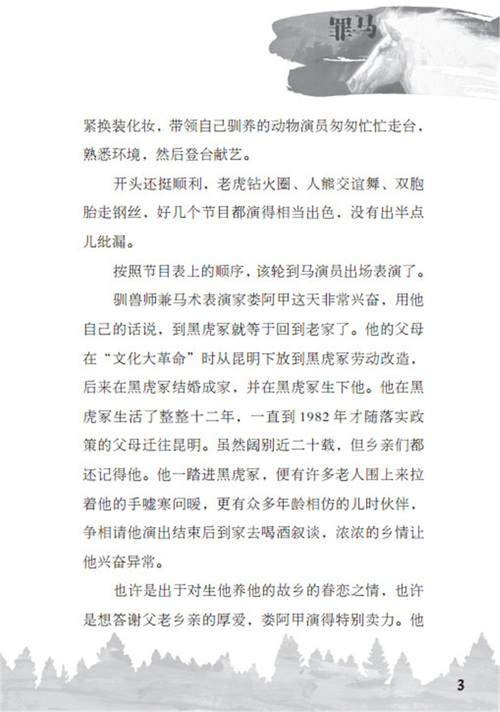 《罪马》讲述了马戏团的表演马白珊瑚无意中害死了自己的主人——马戏演员娄阿甲,非常自责,最后为主人守灵的感人故事。表现了人与马之间的深情,让人读之潸然泪下。《未知的黑暗》和《荒野中的外来者》讲述了两匹骏马在船翻了之后落难森林的故事,文中对马的心理有细致的描写,表现了马这一动物的勇猛和灵性,非常值得一读。《烈马考利贝——执着的骏马》和《溜蹄的野马》则讲述了两匹不羁的马的故事。考利贝与几任主人斗智斗勇,最终归入荒野,赢得了自由。溜蹄的野马几乎战胜了所有想驯服他的牛仔,但最后因为小失误而被俘,它为了永久的自由,选择跳崖,充满了悲剧的色彩。