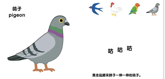 “飞的很快,是谁呢?”“嗖——”“是长着漂亮长尾巴的燕子。”有趣的文字游戏,鲜艳的色彩,帮助婴幼儿在游戏中认识常见的鸟儿。结合挖洞翻页的触觉体验,将图形与知识融合,培养幼儿形象思维能力。 “飞的很快,是谁呢?”“嗖——”“是长着漂亮长尾巴的燕子。”“燕子,swallow”。在游戏中不仅可以认知公鸡(cock)、鹦鹉(parrot)、猫头鹰(owl)各种鸟儿以及英文,还可以通过声音、外观的形容,了解不同鸟儿的各自特征。