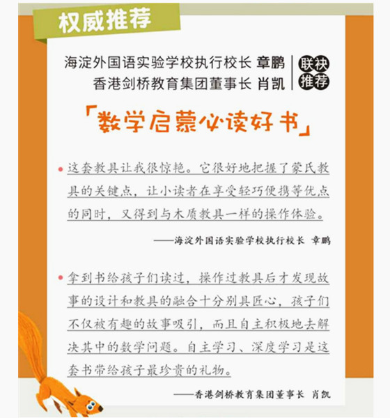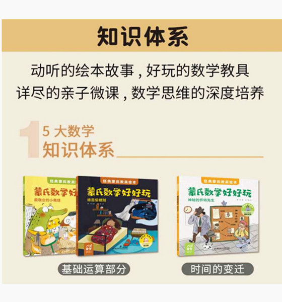 这不是普通意义上的数学绘本,而是一座纸上立体蒙氏园。除了好看的绘本,能动手操作的教具,还有性能在线学习的亲子微课以及让家长对蒙氏有更多了解的《蒙氏数学的奥秘》,从线上到线下,从孩子到家长,从动脑到动手,这套产品的设计让孩子在家也能感受蒙氏教育的魅力和智慧,同时对数学有更好的理解和学习。