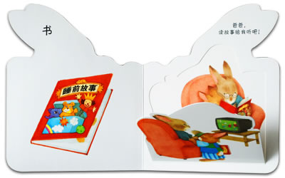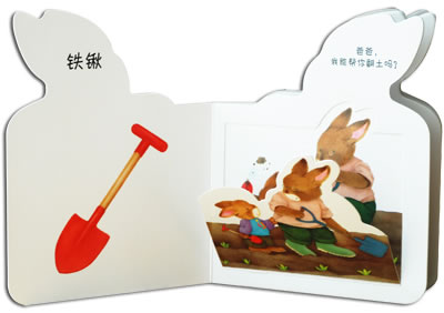 单品认知与场景认知相结合,给孩子一个合理的阶梯式认知过程。你看,书中先将需要认知的物品展示在宝宝面前,再展示一幅场景图,这个场景图中不但有宝宝刚才认知的物品,还展现了物品的用途,再翻一翻折页,展示动态画面,加深记忆理解。内容选择贴近生活,如《帮爸爸干活》让孩子知道一些常见的工具及工具的用途。