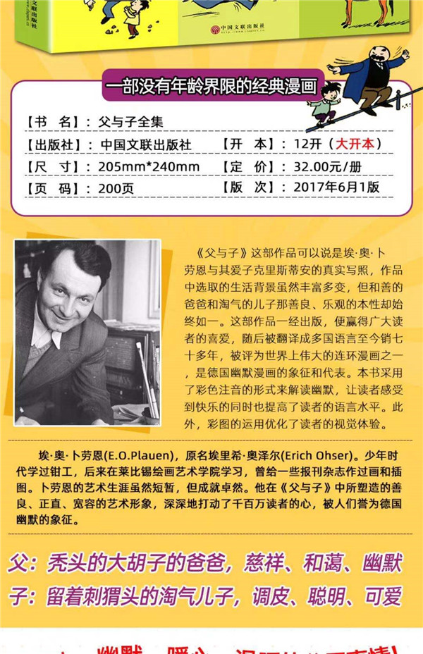《父与子》是德国幽默大师埃·奥·卜劳恩的不朽杰作,它誉满天下、风靡全球。作品中生动幽默的小故事均取材于卜劳恩日常生活中的真实体验,一幅幅小而精湛的画面跳跃着智慧的光芒,简单的线条里流淌出纯真的父子之情与融融天伦之乐,震撼人心。书稿有一定市场需求,有出版价值,建议列选。