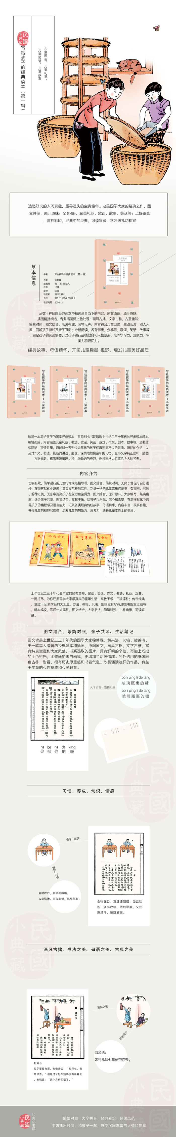 民国儿童读本系列(第一辑),分为儿童礼范、儿童歌谣、儿童笑话和儿童故事四本,选取的皆是民国年代具有启示意义的朴实文章,通俗易懂,适合孩子诵读,有趣而图文并茂,不说教,不乏味,能结合日常生活,不动声色间予孩子们启发,在启蒙阶段,通过轻松活泼、饶有趣味的阅读、学习,得到优秀的汉语言文化启蒙教育。