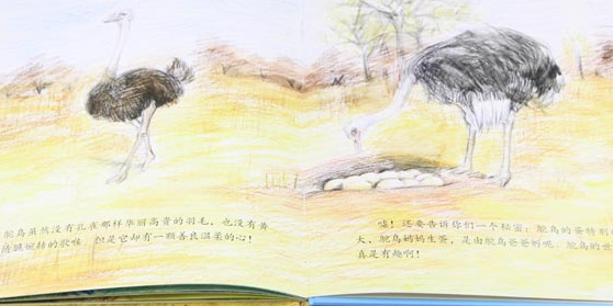 《狂野动物王国绘本》系列,原创手绘彩铅插画与科普知识完美结合,还将有音频故事,带领小朋友走进妙趣横生的动物世界,打造一场视觉与听觉的双重盛宴。鸵鸟的祖先也是一种会飞的鸟类,它是怎么变成今天的模样,这与它的生活环境有着非常密切的关系。鸵鸟是一种原始的残存鸟类,它代表着在开阔草原和荒漠环境中动物逐渐向高大和善跑方向发展的一种进化方向。