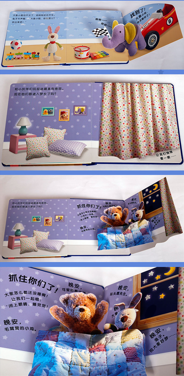 将真实的玩具照片,通过特殊有趣的纸艺,制作成一套有趣的立体翻翻书,让孩子在游戏中进行认知。《该睡觉了》,现在已经是睡觉的时间了,可是兔子去找不到小伙伴了。快来帮她找找看,该上床睡觉的小伙伴都藏在哪里了?衣柜里,还是洗衣袋里呢?
