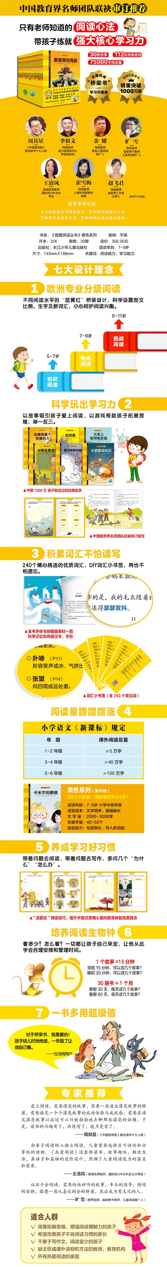 《我爱阅读丛书》(学习升级版)全套系共90册,蓝黄红分别各30册。这是一套面向5-11岁儿童,由欧美知名作家、专业绘本家联袂打造的桥梁书。桥梁书是一种让孩子从绘本、拼音本过渡到正常阅读的必备读物。与其他桥梁书不同的是,《我爱阅读丛书》(学习升级版)采用不同阅读水平的“蓝黄红”桥梁设计,译文生动流程,完整还原欧美故事思维,同时科学设置图文比例、生字及新词汇,并配有中国教育界名师团队编写的思维拓展训练游戏,小心呵护孩子的阅读兴趣,是孩子真正跨过阅读门槛、实现阅读独立的成长里程碑。
