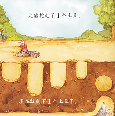先看着画有十个土豆的图片,和孩子一起数土豆。然后在翻书的时候,要让孩子意识到地底下的土豆正一个一个地减少。每翻一页就要说:“又有一个土豆消失了。是谁拿走了呢?”这样就可以唤起孩子对本书的好奇心。