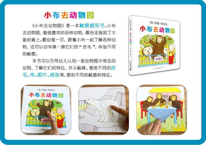 《小布去动物园》是一本触摸感知书,引导幼儿认知一般动物园中常见的动物,了解它们的特征,并从触摸、感觉不同的皮毛、布、胶片、纸张等,感知不同的触感和特征。