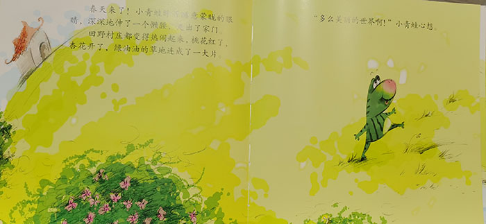 春天来了!小青蛙睁开睡意朦胧的眼睛,深深地伸了一个懒腰,走出了家门。田野村庄都变得热闹起来,桃花红了,杏花开了,绿油油的草地连成了一大片。