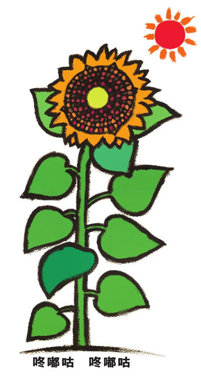 一粒小种子埋入土地里,开始发芽了,“咚嘟咕,咚嘟咕”,在阳光、雨露的滋润下,经历着白天、黑夜的循环和土壤的蕴育,从细嫩的幼苗到枝繁叶茂,再到成熟,开花结果,结出葵花子,最后,小种子落入泥土,新的生命又开始孕育了……《向日葵》以“咚嘟咕”的音响将向日葵茁壮生长的过程具象化,放大化。整本书犹如一部微型电影,随着一页一页地往下翻,音响效果逐渐增强,勃勃的生命力也越发壮大,让我们不仅了解了向日葵的生长过程,更感受到生命世界的强大震撼力。
