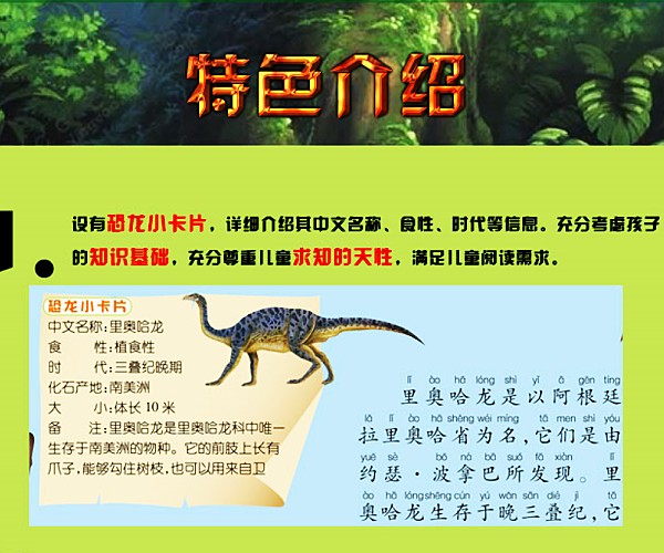大多数孩子都喜欢恐龙,甚至痴迷于恐龙,他们有的喜欢恐龙庞大威猛的身躯,有的喜欢恐龙震耳欲聋的叫声,有的喜欢恐龙飞速奔跑的英姿。但是,大多数孩子都不知道——作为中生代地球的主宰者,恐龙有哪些种类,它们主要生活在什么地方?恐龙会吃什么东西?恐龙会不会打架,它们的武器是什么?恐龙宝宝是怎么出生的?……