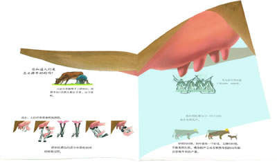 这是一套有魔力的书,它使世界变得透明,当我拿着书给3岁半的孩子看时,在孩子的眼里,我仿佛成了世界上最棒的魔法师。“这是只母鸡,你看,母鸡生蛋了。”我一边说,一边翻开胶片页,顿时,鸡肚子里面的一切呈现在孩子眼前,他惊奇地看着。我继续给他讲着:“鸟类都是生蛋的……”然后我一页页地帮他翻着。他似懂非懂。接下来几天,我看到孩子对这本书爱不释手,他把胶片的那几页翻过来又翻回去的“研究”起来。那一刻,我脑子里面一点也想不起来他把东西翻得乱七八糟的样子,在我眼前,他仿佛变成了一个小小的学者。