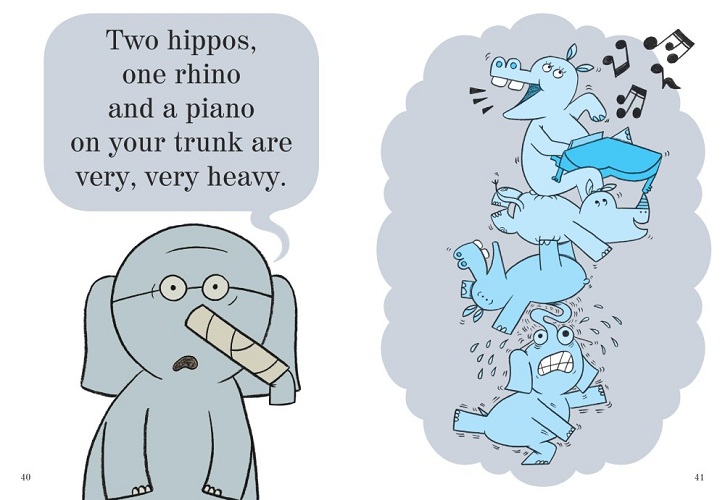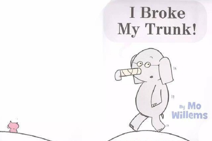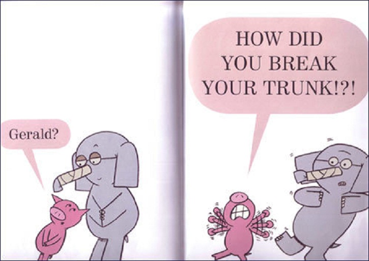 When Piggie sees Gerald with a big bandage on his nose, she asks, "How did you break your trunk?" It's a long story. First Elephant tried to lift Hippo with his trunk. "Is that how you broke your trunk?" Piggie asks. No, there's more. Then Rhino came by, and Gerald lifted him with his trunk too. But even that isn't what broke Gerald's trunk. Gerald's story grows longer and more ridiculous as the book goes on and is topped off by a silly twist at the end. This may well be the funniest Elephant and Piggie yet!