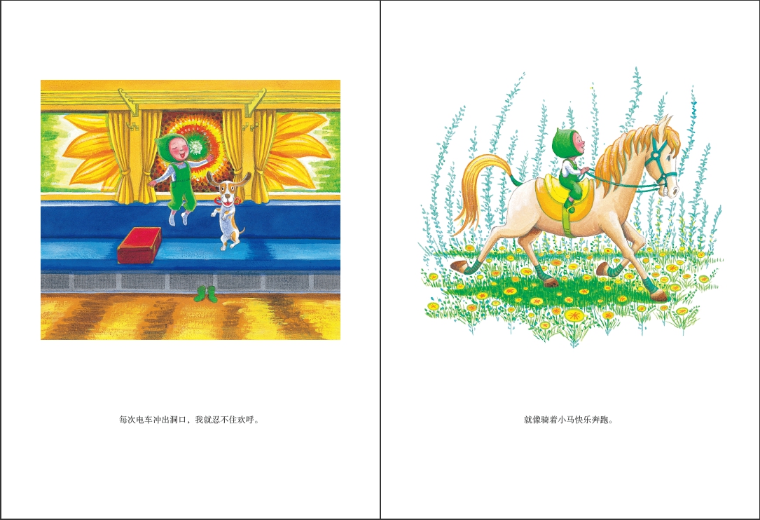 小树和布丁狗搭电车到乡下找外公,电车沿路叮当叮当响,