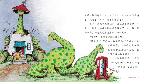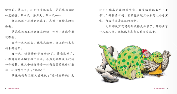 这是一本幽默风趣的恐龙故事书。故事围绕着芦花鸡妈妈孵出的孤儿雷龙小乖和坏坏公主展开。坏坏公主一路坏到底,差点毁了整个王国,幸亏芦花鸡奶奶孵出了恐龙小乖,拯救了大家。整个故事充满幽默,让小读者们伴随作者天马行空的想象开心一笑的同时开启他们的阅读之旅。