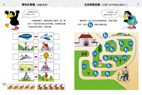 12大主题,带给孩子全面的常识启蒙。认识自然与社会,是孩子成长的必需。本书将购物、农场、动物、工作等常识巧妙融入题目与画面中,让孩子在做题过程中了解日常的薯条与面包来自于何处,钱的用途及取钱设施,怎样过马路才是最安全的,不同的职业分别对应着怎样的生活,等等。