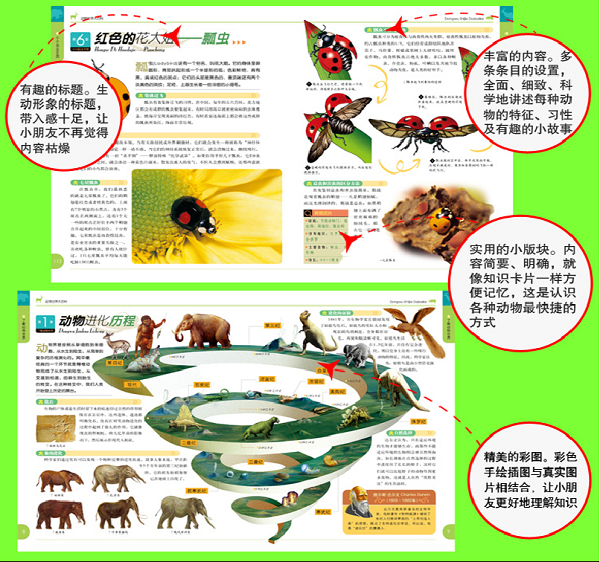 有图片,有文字,还有各种昆虫、动物的介绍和讲解。幼儿园小朋友主要以看图为主,看图讲给孩子听,讲一遍就能复述了。很好的书。