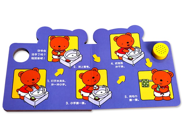 这是一套针对1-2岁幼儿培养良好行为习惯的游戏书,包括洗手、开门两个主题。以可爱的豆豆熊为主角,用简单的语言还原“开门”“洗手”的场景,设置发声器,按下就会发出门铃、洗手的声音,真实声音效果将场景与宝宝的实际生活相融合,让宝宝有种身临其境的感受,帮助宝宝养成健康良好的生活习惯。加厚纸板,特殊圆角设计,保证宝宝小手的安全性;书内设有翻翻页,增加趣味性。