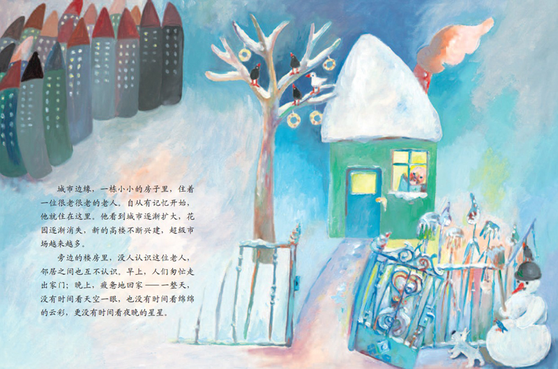 城市边缘,一栋小小的房子里住着一位很老很老的老人。就快到圣诞节了,老人用金箔剪了许多许多的星星,来为送礼物的圣诞老人指路。可是,窗外的霓虹灯非常亮,他担心圣诞老人看不见他的星星,于是决定带着星星出门寻找圣诞老人。