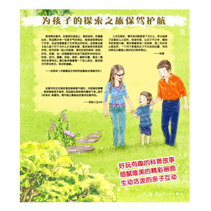 为幼儿量身打造的注音版《幼儿版十万个为什么》选取的知识点来源于数千份调查问卷,关注孩子感兴趣和生活中会遇到的问题。由数位国内科普作家,在较充分研究幼儿心理和年龄特点的基础上,从幼儿的视角,用亲子互动的形式,通过一个个生动的故事来解答和讲述知识。