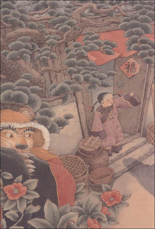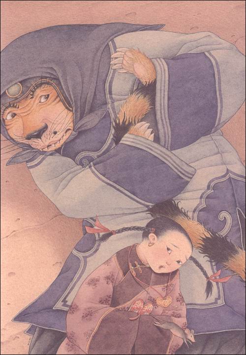 老虎精特别喜欢吃细皮嫩肉的胖小孩,它吃了小孩,还要收集一些纪念品,像是小孩子身上佩戴的金锁片、金手环和长命锁,都被它拿来装饰斗篷。