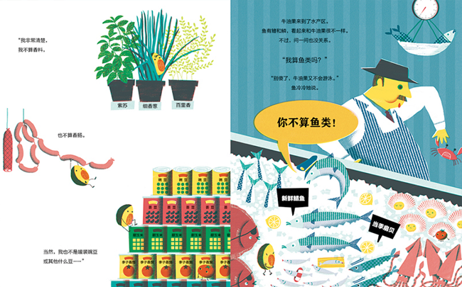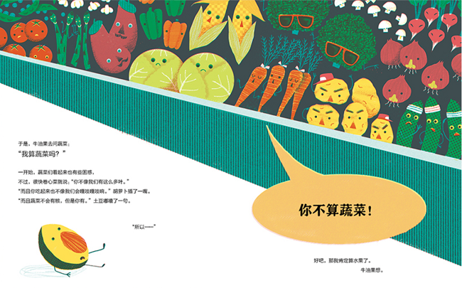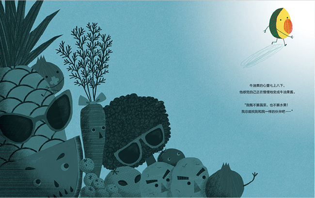 《牛油果的疑问》是广西师范大学出版社魔法象图画书王国推出的作品之一。 牛油果被放在超市的水果蔬菜区,他的生活十分简单,没有什么疑问,没有什么问题,也没有什么困扰……直到一个小女孩提出了一个难题:“牛油果是水果还是蔬菜?”牛油果愣住了,他也不知道答案,所以到处询问,水果说他不是水果,蔬菜说他不属于蔬菜。牛油果还去问了奶酪、鸡蛋,还是没有找到答案。在他焦虑的时候,番茄出现了,番茄鼓励牛油果,不要太在意我们属于哪一类,只要做好自己就足够了!