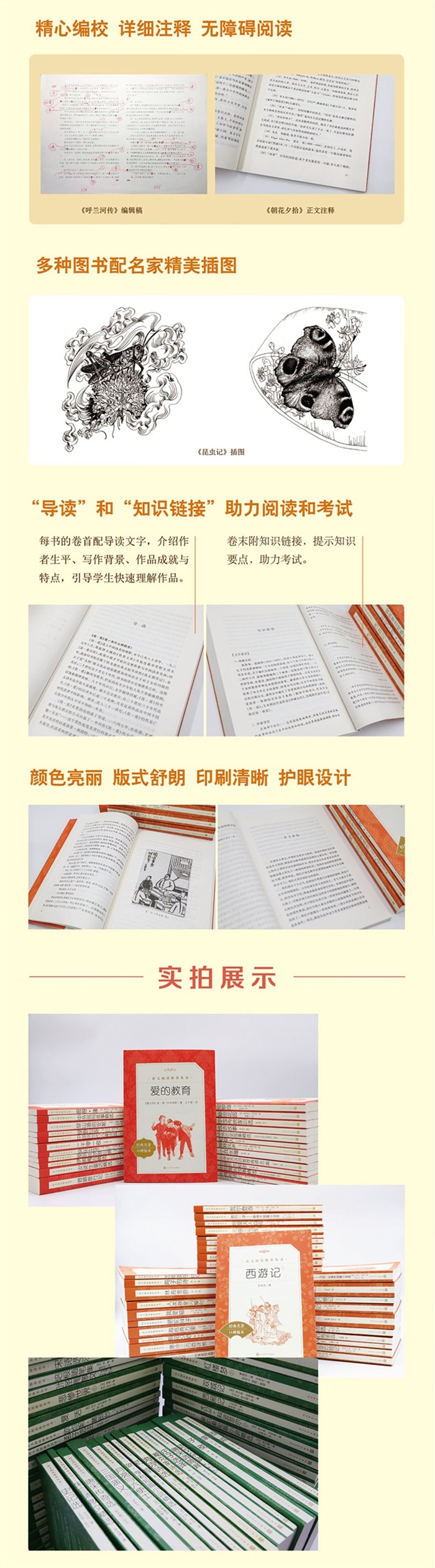经典名篇是人类思想智戇和审美感受的结晶,人民文学出版社在中外经典的整理、译介和出版上有着卓越贡献和值得信赖的品质,“语文阅读推荐丛书”同样如此。 ——著名作家 王蒙 我这些年是提倡让中小学生“海量阅读”的。人民文学出版社这套书品种齐全、版本可靠、质量上乘,非常适合学生阅读。 北京大学教授、教育部统编语文教科书总主编温儒敏 作为专业的文学出版社,人民文学出版社的这套书选目完整而全面,在古典名著、外国作品的整理和译介上,也都采用了独家的大师底本,值得推荐! 著名作家、北京大学教授曹文轩 统编语文教科书陆续使用后,文学阅读在中小学教育中的地位空前提高。人民文学出版社这套书紧扣统编教材的内容,充分照顾到了学生拓展阅读的需要,内容丰富,结构合理,是一套理想的语文读本。 ——中国教育政策研究院副院长、新教育实验.发起人朱永新