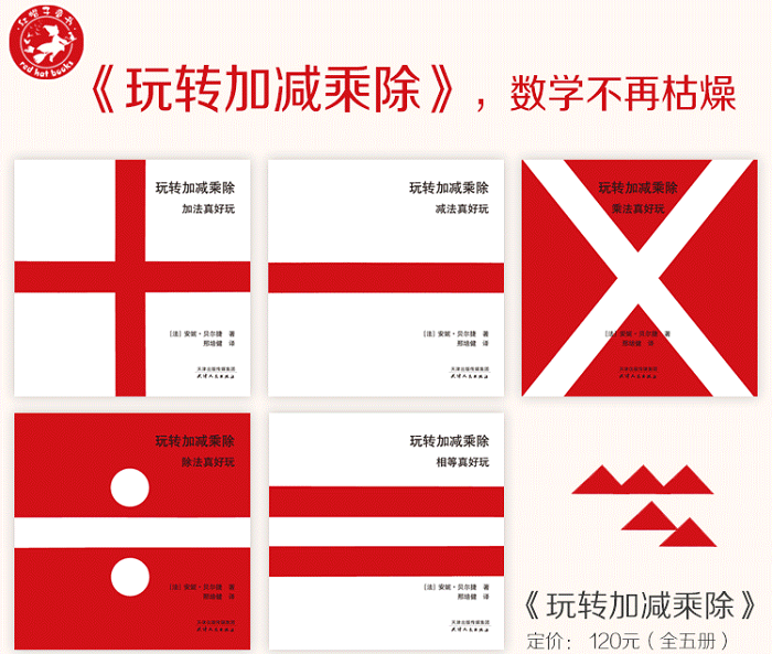 《玩转加减乘除》创意数学思维绘本(全五册)包括《加法真好玩》《减法真好玩》《乘法真好玩》《除法真好玩》《相等真好玩》五本,作者选取对比鲜明的红、白两色,运用简单的三角形、矩形、圆形等,像做游戏一样,对加减乘除运算作出形象有趣的解释。书中还附有可剪下来的图形卡片,让孩子能够亲自动手,学习基础的数学运算知识,感受图形无穷变化的丰富魅力,深刻理解图形面积的守恒定律。