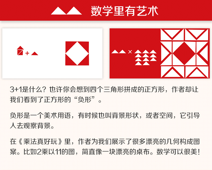 作者选取对比鲜明的红、白两色,运用简单的三角形、矩形、圆形等,像做游戏一样,对加减乘除运算作出形象有趣的解释。