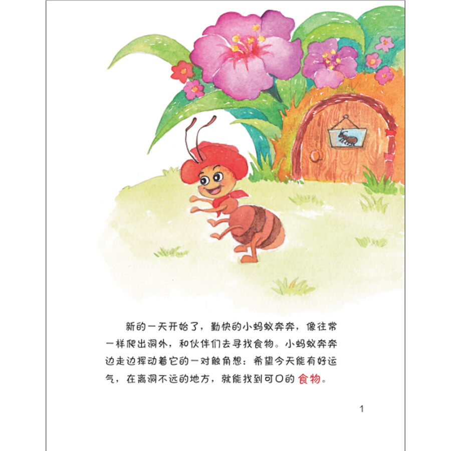 勤快的小蚂蚁奔奔一开始寻找食物并不顺利,刚发现的麦粒被麻雀抢走了,不过,它并不灰心,又继续找到了面包屑、死苍蝇、舔杏、蜂蜜、蜜露等食物。在途中,它还碰到了一群白蚁,差点被一位戴口罩的叔叔连同白蚁一起消灭掉……情节起伏的故事,加上颜色鲜亮的手绘图,可爱的小动物形象,让小读者爱不释手。