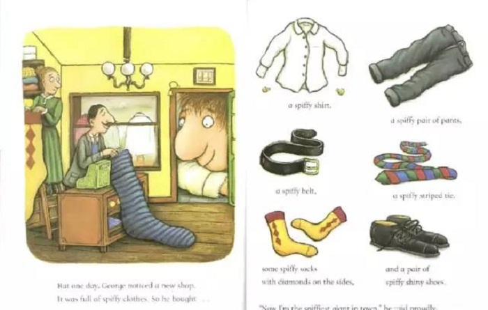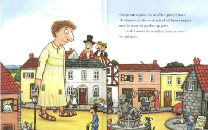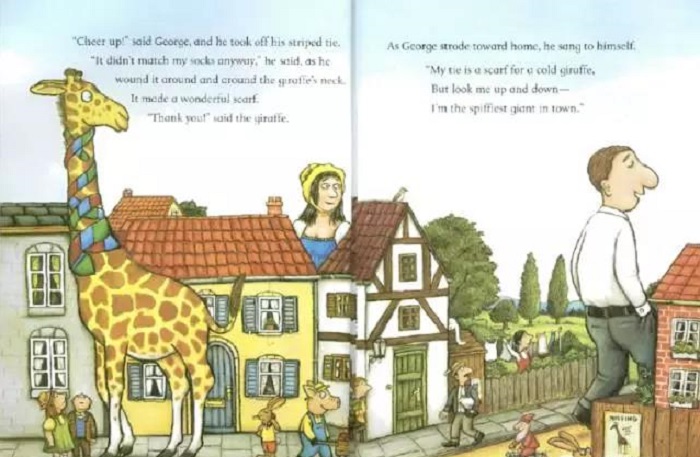 乔治是个巨人,城里最邋遢的巨人。他总是穿着同一双棕黄色的旧凉鞋,同一件打着补丁的旧袍子。然而,乔治却有一顶美丽的金冠,因为他是城里最最好心眼儿的巨人,也是城里最最快乐的巨人,你看他单脚跳着走,边走边唱的样子就知道。一个人,如果真是愿意帮助别人,那么这种快乐就会是抑制不住的。