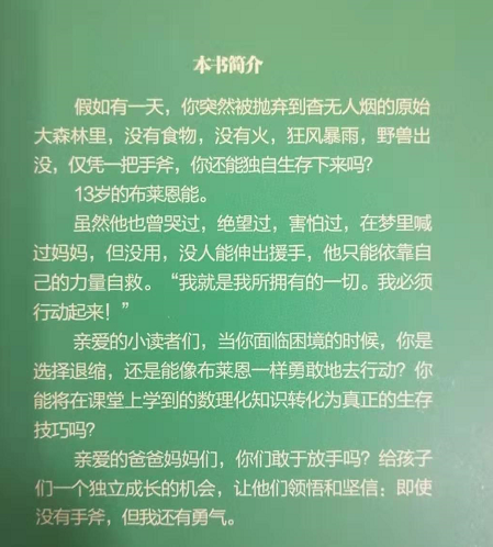 布莱恩13岁了,他要去爸爸那里过暑假,爸爸在哪里呢?爸爸在加拿大北方的原始森林里,他在那里从事油田的工开采工作。布莱恩如何才能到达自己向往已久的原始森林呢?一天,机会终于来了,有一架飞机要飞回油田,布莱恩便成了这架小飞机上的惟一乘客。然而,谁曾料到巨大的不幸这时却降临了,驾驶员心脏病突发猝死,飞机摔落在杳无人烟的森林深处。还好,布莱恩幸免一死,但密林深处危机重重,生存陷入困境——绝望、恐惧、饥饿、大黑熊、狼、驼鹿……上飞机前,妈妈送了他一把手斧,手握斧头的布莱恩能够生存下来吗?狼来了,他怎么办?没有火,他怎么办?没有食物,他怎么办?布莱恩真的能活下来吗?如果有一天,我们这些吃麦当劳长大的青少年,碰上了类似情况,又会怎么办?我们有足够的野外生存能力吗?我们能够将数学、物理、化学等课本知识转化成野外生存技巧吗?