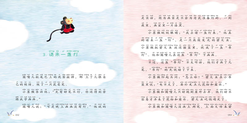 有一只丁点儿丁点儿大的小墨猴,住在画家的笔筒里。画家每次画完一幅画,小墨猴总是灵巧地跳过去,舔干净毛笔上和砚台里的墨汁。不仅如此,小墨猴还跟着画家学会了画画。画家喜欢他,每天都往笔筒里丟一粒香喷喷的果仁儿。一只叫圆嘴儿的小老鼠羡慕极了,他也好想吃美味的果仁儿哟!现在,圆嘴儿成了小墨猴的好朋友,也要开始学习画画了… …
