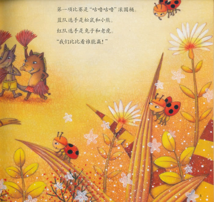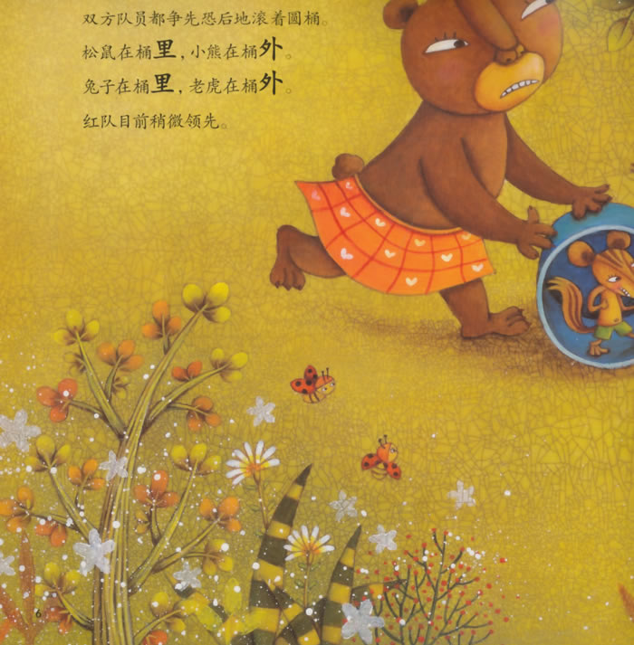 《森林运动会》一书,讲述的是小动物召开运动会的故事。松鼠在桶里,小熊在桶外;狮子站在狼前面,老虎站在*后面……读着生动有趣的故事,不知不觉中就能学会里、外、前、后等空间概念。
