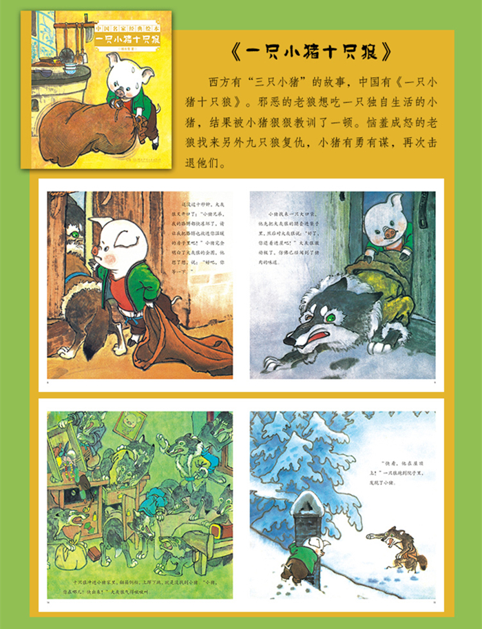 “中国名家经典绘本”系列精选我国绘画名家杨永青先生的5册经典作品。《一只小猪十只狼》讲述了邪恶的老狼想吃一只独自生活的小猪,结果被小猪狠狠教训了一顿。恼羞成怒的老狼找来另外九只狼复仇,小猪依靠智慧和勇气再次打败他们。