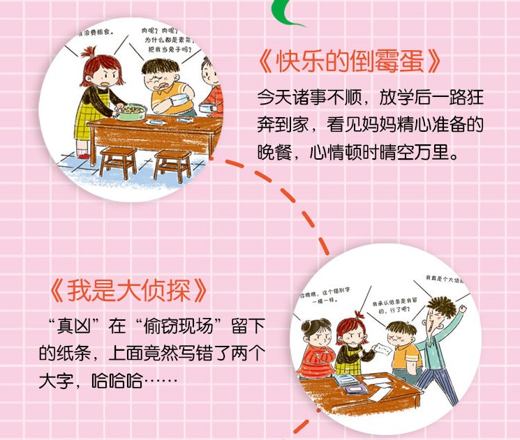 书中设计了场外式境头漫画,幽默风趣,绘制风格可爱,具有吸引力,孩子在阅读休息时,可以做为另外一种艺术欣赏。漫画中的配文未注音,这样做的目的是激起孩子对生字的求知欲,可帮助他们快速、有效地记忆生字。配文也大胆脱离了正文,并未与文中的文字使用保持一致,独立的语言使情节场面更加活跃,使人物更加立体、饱满,更能丰富地表现出故事特点及人物性格。连续的漫画构成一个完整的故事,让小读者快速、直观地了解整个故事,力荐阅读。