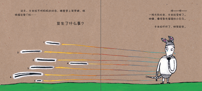 小斑马卡米拉外出玩耍时遇到一阵强风,风把她的背带裤,连同身上的条纹统统吹走了。现在,她看起来像浑身光溜溜的白骡子。除了哇哇大哭,小斑马卡米拉不知道自己还能做些什么。幸运的是,她遇到了一些满怀善意的朋友,大家纷纷用自己的方法帮助卡米拉,带给她新的条纹:戒指、彩带、鞋带……甚至是小提琴的弦。在接受大家馈赠的同时,卡米拉的心情一点一点好了起来,她也馈赠给自己一份珍贵的成长的礼物——接受改变,坦然面对改变,带着一颗非常非常轻盈的心。