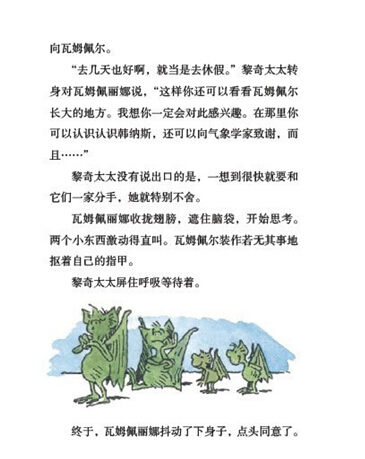 黎奇太太做出一个决定黎奇太太发现自己总是在不停地叹息。于是她自责道:“黎奇,你这个不中用的老婆子!你不是最讨厌自哀自怜的吗?振作起来,出去散散步,找点儿事情做,随便干什么,就是不要叹息、抱怨。”但那一点儿帮助也没有。瓦姆佩尔不在窗帘横杆上,瓦姆佩尔不在拉扯她的头发,瓦姆佩尔不在小筐里吱吱叫。她一闭上眼睛,就看见瓦姆佩尔在小筐里向她招手,一直到气球在蓝天上消失。当她弯腰拉丝袜的时候,膝盖疼得不行,她忍不住发出呻吟。 已经上午十点了。每到这时她就心神不宁地专注于门外的动静,连咖啡也不想喝了。她听到邮递员的脚步声和他转动钥匙开信箱的声音,以及邮递员走后大门在他身后撞上时发出的沉闷声之后,就会下楼看看,虽然她知道肯定没有瓦姆佩尔的信。如果有信,邮递员会上楼来,因为瓦姆佩尔绝对不会记得贴邮票。黎奇太太把信箱里的几张广告用力扔进废纸篓,使劲盖上盖子,然后艰难地上楼了。韩纳斯现在已经是少年足球队的中锋了。他虽然几乎每天都过来,但大都只待五分钟就走了。“以前你自己一个人不是也过得很好吗?”黎奇太太自我安慰说。 可是,过去是过去,现在是现在。 有时候,黎奇太太真的很烦。“你这个坏蛋,”她看着空荡荡的窗帘横杆骂道,“你起码也该写封信来,让我知道你过得好不好啊。”五月的第一个星期四那天,韩纳斯冲进来,把一本彩色的旅游杂志塞到黎奇太太手里。“翻到第十三页!”他气喘吁吁地说,“也许这正是您需要的。我必须去训练了。”大门随即在他身后关上了。“旅行广告和我有什么关系?”黎奇太太嘟哝着,“我不会被吸引到西班牙去,也不会去马尔代夫,而对我来说,非洲太热,火地岛又太冷。”可是,现在这个东西既然已经在手里,那就随便翻翻吧。翻开第十三页,她愣住了。上面写着——“德库拉之旅”。 特兰西瓦尼亚之旅,参观德库拉的宫殿,参加吸血蝙蝠之夜的舞会! 黎奇太太把两条腿放到地上,一使劲站了起来。她穿上一双舒适的鞋,戴上草帽,从抽屉里取出存折,出门了。 旅行社的年轻人请她坐下。她小心翼翼地在一张椅子腿是细细的蜘蛛腿式的黑色椅子上坐下,令她惊讶的是,椅子不但没有倒,而且坐起来很舒适。 “我想参加德库拉之旅。”她说。年轻人听了直摇头,他说:“这条旅游线路可不轻松。我向您推荐我们专门为老年人安排的一条去马洛卡的线路,特别优惠。”黎奇太太将桌子上的旅行广告推开,广告掉到年轻人的怀里。“啊,对不起。”她表示歉意,“我就要去吸血 蝙蝠的故乡——特兰西瓦尼亚。”“当然,随您的便。我只是告诉您,此行有风险。我建议您购买特别旅游的回程保险。”说完,年轻人咳嗽了一下。 “意外险和人寿险都要买吗?”黎奇太太亲切地问道。年轻人垂下眼睛,用一种悲怜的表情说道:“是的,以防万一。”黎奇太太在所有的保险单上都签了名,并让年轻人以书面确认她将坐在大客车的第一排座位上,然后昂起头离开了旅行社。竟然觉得我参加这样的旅行太老了,真是不知天高地厚! 当黎奇太太一言不发地把旅游订单递给韩纳斯的时候,韩纳斯高兴极了。“要是我能一起去就好了。”他说,“您会给我寄明信片的,对吗?”黎奇太太答应了他。她请韩纳斯帮忙把旅行箱从柜子上取下来。“三个星期之后才启程呢,”韩纳斯说,“您不觉得现在就把箱子拿下来太早了吗?”“是的。”黎奇太太承认是太早,“但早点儿的话我可以更好地做计划。你知道,人们做任何事情都不能太草率。即便我会经常被箱子绊到,我也会为这次旅行而感到高兴。”当天晚上,她开始做体操。一个星期之后,她的膝盖就能重新屈伸了。在进行身体前屈的时候,她甚至能够到脚趾。她还能边单脚站立,边用另一条腿转圆环而不摇摇晃晃。她对自己的状态非常满意,还重新整理了三次箱子。但最后她却有些害怕了。也许那个年轻人说得对,她要参加这次旅行的想法太过疯狂了?疯一点儿还好,但太疯了……下午,有人来敲门。门口一大束春白菊和风铃草映人眼帘,后面露出一头蓬乱的红发。“我想再次向您打听一下,有没有瓦姆佩尔的消息。您还记得我吗?”花束后面的男人问道。“我当然记得。”黎奇太太说,“您就是那个气象学家,让瓦姆佩尔坐气球飞行的主意就是您想出来的。”那个男人点点头:“有时候我问自己,您会不会生我的气。如果没有我的介入,瓦姆佩尔可能还待在您身边。它走了,这都怪我。”黎奇太太摇摇头,又点点头:“是的。有时候,我真的很生您的气。可是,即使您不帮它,它也会走掉,去寻找它的瓦姆佩丽娜。总之我是阻止不了的。您请进,请坐!我马上煮一杯好喝的咖啡给您。”气象学家在门槛上绊了一个踉跄,接着又跨过放在屋子当中的行李箱。当他们俩坐在厨房的餐桌旁时,黎奇太太对他讲了自己的打算。 P1-8