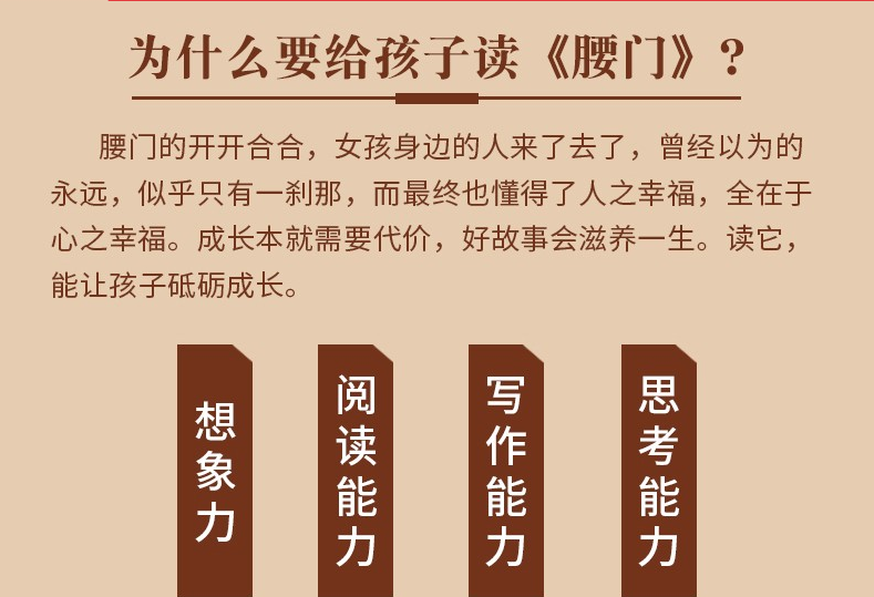 本书透过孩子的视角窥见世界,讲述地是这样一个故事:爸爸妈妈要修一条很长很长的铁路没时间照顾六岁的沙吉,就把她寄养到边远小城的温婉而坚忍的云婆婆家里,那里的民居都有两扇韵味的腰门,每天每天,沙吉在腰门间出出进进,善良的水、好运的青榴、美丽的苇林姐、勇敢的铜锣、可爱的巧巧、心仪的哥还有不期而遇的小大人,也在沙吉童年的日子里分分合合,让她的成长岁月变得多姿多彩、与众不同并且意味深长.