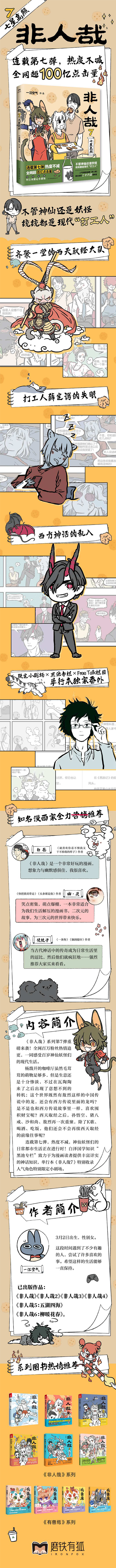神仙妖怪的爆笑喜剧打工人日常,微博700万粉丝追更的人气国漫,《非人哉》第八弹爆笑上市! 财神爷赵公明,携手神兽元宝、萌萌招财童子,一起在线撒钱。瓦猫陶陶凡心萌动,钢铁直男哮天却只想和她结拜兄妹?!不小心喝下魔法糖水的哪吒,变小以后激萌,塞进破袜子里也可可爱爱……新书限定小剧场,揭秘哪吒和悟空的上古纠葛。还有黑池专栏,白泽专业科普红孩儿的身世之谜。 热热闹闹的神仙妖怪都市生活正在进行时,连载七年,用欢脱又纯粹的快乐,给平凡忙碌的日常一剂温暖的强心针。
