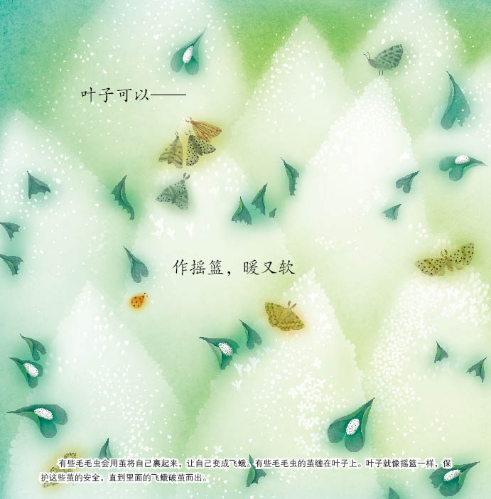这《叶子的猜想》,既是美丽的诗歌、又是好听的故事、更是解密叶子的科普书。每一页以诗歌的形式告诉我们叶子的作用,而且在每一页的下面还有一行小文字有详细的解释。绘本除了诗歌美、语句美,生动地描绘了大自然的形象,插图也非常漂亮,把四季的叶子通过不同的景色描绘得生动逼真,充满了立体感。