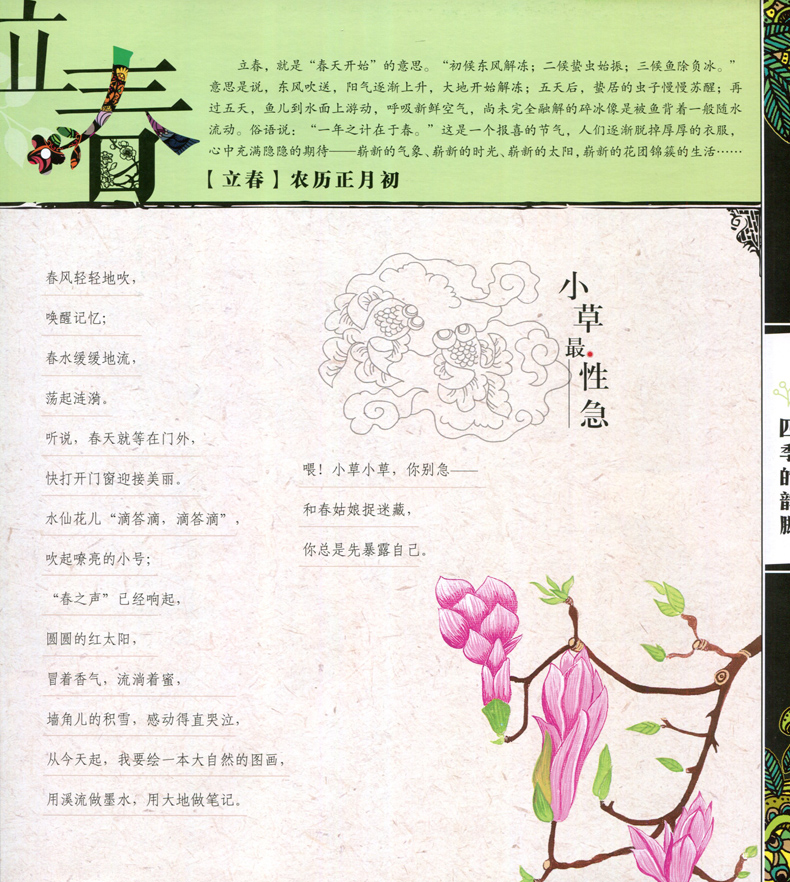 二十四节气,是中华传统文化和风俗的一个浓缩,这本书以二十四节气为序,每个节气前有一小段关于该节气的介绍,相应的配上该节气的一首儿童诗和插图。每首诗清明、明快、朗朗上口,音韵悠远,具有可读性、文学性、知识性、趣味性,达到教育和审美相结合的双重效果。